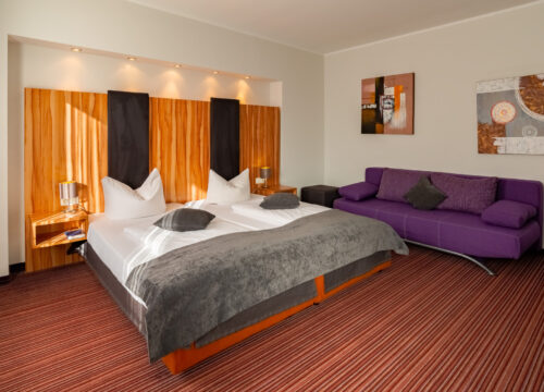 Unsere Standard- oder Superior- Dreibett- und Vierbettzimmer eignen sich für die Unterkunft mehrerer Personen oder einer Familie. Noch mehr Raum bietet unsere Suite.