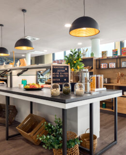 Wir haben keine klassische Hotelbar. Getränke können an der Rezeption erworben werden, die Du dann in unserem gemütlichen Loungebereich oder auf Deinem Zimmer konsumieren kannst.