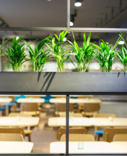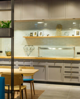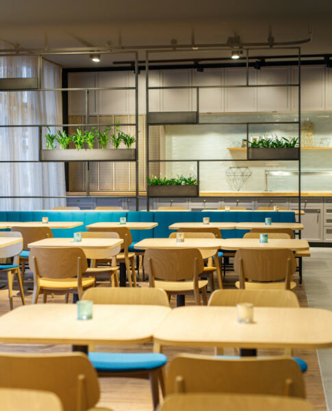 Im großen, luftigen Frühstücksraum blickst Du zur einen Seite auf eine riesige Fensterfront Richtung historisches Zentrum. Wir haben die Fenster mit bodentiefen, schönen Vorhängen versehen und den Frühstücksbereich mit hellem Mobiliar und Vinylboden ausgestattet – für blau-gelbe, warme Farbkleckse sorgen die Stuhlkissen und die Bankpolsterung. Schließlich spricht nichts dagegen, die erste Mahlzeit des Tages in einem wohnlichen, freundlichen Ambiente einzunehmen. Am Ende des Raums wartet das Buffet mit warmen und kalten Speisen auf Dich. Beim Frühstücken Göppingen reicht die Auswahl vom frisch gebackenen Brot und verschiedenen Käsesorten über Obst und Joghurt bis hin zu Rührei, Würstchen, Müsli, Lachs und Pancakes. Optionen für die vegetarische oder glutenfreie Ernährung gibt es auch.