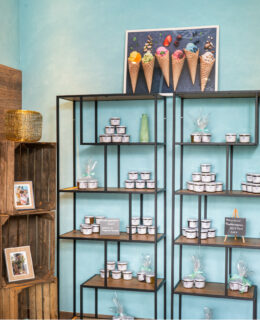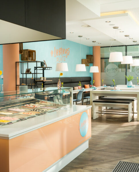 In das Interieur vom Lieblingsplatz, der Eisdiele Kleve, verliebt man sich sofort: Der Pfirsichton in Kombination mit diesem leckeren Hellblau hat eine magische Wirkung – und die hört definitiv nicht beim Gucken auf. Von März bis Oktober werden hier 18 Eissorten, darunter Klassiker, aber auch außergewöhnliche Sorten wie Erdnussbuttereis, Stachelbeereis, Apfel-Zimt-Eis und unser Lieblingseis, Joghurteis mit unserem hausgemachten Fruchtaufstrich, angeboten. Wir arbeiten mit einem lokalen Eisfabrikanten zusammen, der ganz genau weiß, welche saisonalen Spezialitäten unsere Region zu bieten hat. In Kombination mit Milch aus der Region ist der Geschmack einzigartig. Neben Eis und Eisbechern servieren wir auch Bubble Waffeln und Pfannkuchen – am Tisch und auf der Terrasse oder zum Verzehr auf den Uferstufen.
