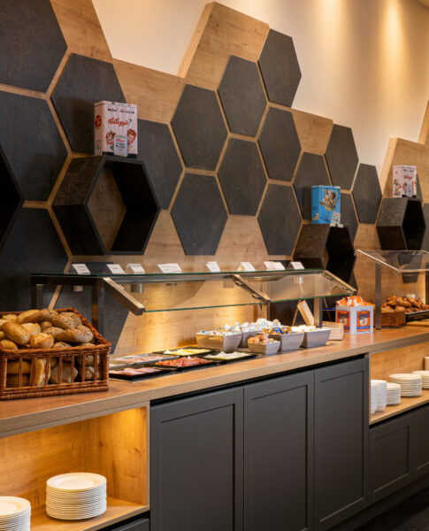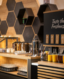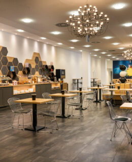 The wall, artfully enhanced by its honeycomb pattern of light and dark wood, harmonises perfectly with the floor and tables in the breakfast room. Modern wire-mesh chairs (also available as high chairs) lend this room an airy feel. Cognac-coloured bench seating and a varied mix of ceiling lights impart a sense of well-being at this early hour. Your taste buds will share the same sensation when you tuck into the sumptuous selection of cold and hot dishes from the breakfast buffet. They include scrambled eggs, bacon, hash browns and boiled eggs, numerous types of bread and fruit, and of course cheese and sausage. The wall at the far end of the breakfast room consists of a large mural, colour coordinated with the flowing curtains in vibrant blue. Enjoy your breakfast Leipzig at the elaya hotel.