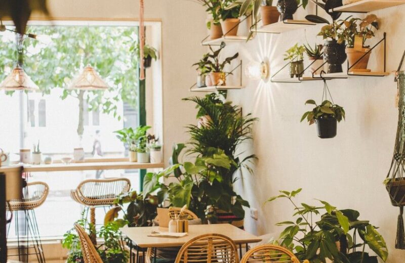 Was es aber auf jeden Fall, auf den ersten Blick, ist: grün, einladend, instagramable und ein Fest für die Augen für alle, die schönes Boho-Interior lieben. Das Geheimnis der Location lüftet sich beim Betreten: Sie ist irgendwie alles! Ein supersüßes Café mit hausgemachtem (veganen) Kuchen und Kaffeespezialitäten, ein Geschäft, in dem Du Pflanzen, Töpfe und Deko kaufen kannst und so gemütlich wie ein Wohnzimmer, das von jemandem mit grünen Daumen eingerichtet wurde. An den großen Fensterfronten gibt es zudem Plätze zum Arbeiten oder um einfach nur das Straßenleben zu beobachten – begleitet von einem Glas Wein oder Pflanzen-Talk!