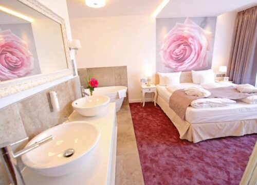 Das Doppelzimmer mit Deko im rugs Hotel am Schlosspark Lichtenwalde Die Dachterrasse des rugs Hotel am Schlosspark Lichtenwalde