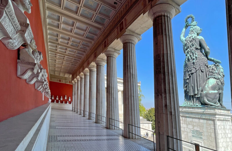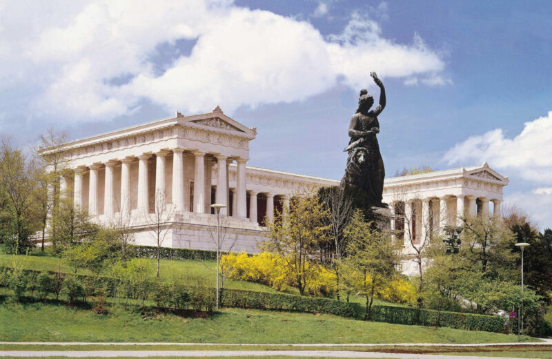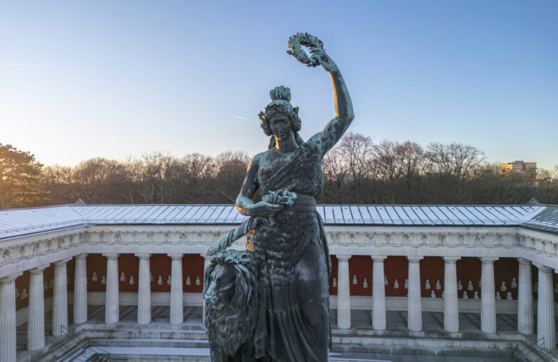 Wie wild es ab Ende September hier auch zugehen mag, eine Dame behält den Überblick und die Ruhe: Bavaria, die 18 Meter hohe Bronze-Statue, die weltliche Patronin des Freistaats, die 1850 fertiggestellt wurde und nun über der Theresienwiese thront. Sie gibt nicht nur ihr Äußeres, sondern auch ihr Inneres preis: steig ihr über eine Wendeltreppe zu Kopf und die Aussichtsplattform eröffnet Dir einen grandiosen Blick auf das Areal. Hinter der Bavaria befindet sich die Ruhmeshalle, eine eindrucksvolle Säulenhalle, die die Büsten bedeutender Bayern beheimatet.