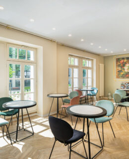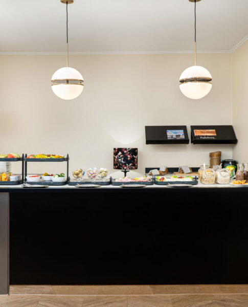 Das Design der Frühstücksbar ist ein bisschen an die Kaffeehaus-Ästhetik angelehnt. Egal, ob Du der herzhafte oder süße Frühstückstyp bist, unser Buffet wird Dir gefallen. Mit einer großen Auswahl an Obst sorgen wir auch noch für Deinen ausgeglichenen Vitamin C-Haushalt! Vitamin D gelangt durch die großen Fensterfronten.