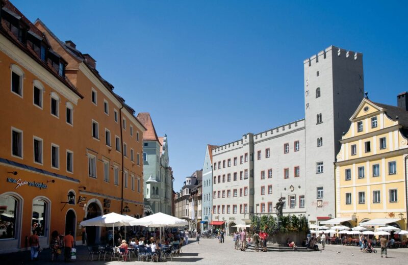 And according to legend, it was where the Regensburg champion Dollinger fought a duel with the giant pagan knight Krako, an event that has been re‑enacted at the same spot every summer since 1996. No less dramatic was the tightrope crossing attempted by a French surgeon… The square is also a meeting place for locals, artisans, musicians and for anyone who is fascinated by the stories behind old buildings. And are also interested in the celebrities of the past about whom numerous anecdotes are told, for example in the Zum Goldenen Kreuz inn and the Thon-Dittmer-Palais.