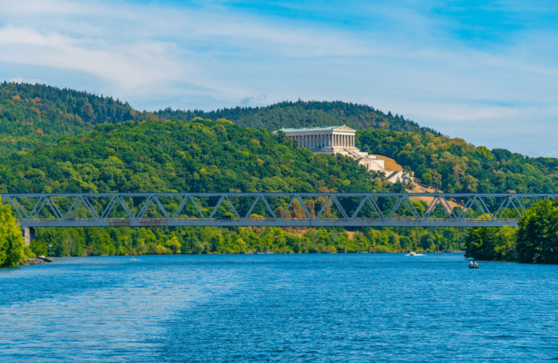 Walhalla stands out commandingly against its surroundings, nestled against a green backdrop above the Danube. The neoclassical construction was based on a temple and is surrounded by columns.