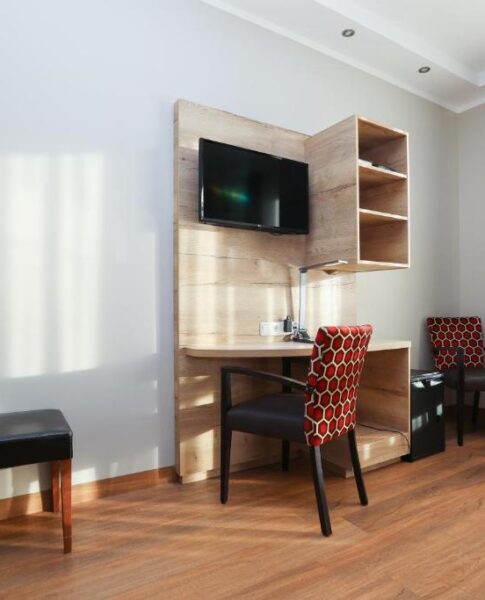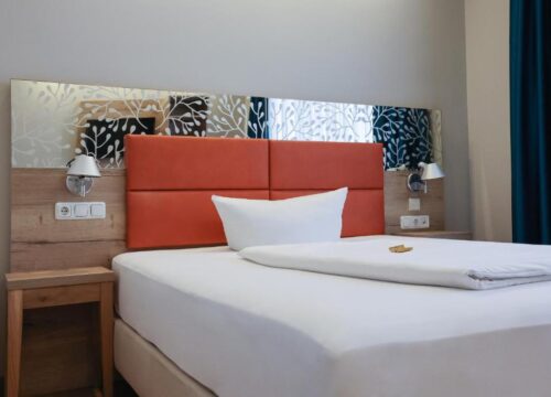 Geradlinig. So könnte man unsere Zimmer mit einem Wort beschreiben. Die Linien einiger Doppel- und Zweibettzimmer heben sich allerdings durch ihre Farbe vom Rest der Einrichtung stylisch ab. Neben dem Schreibtisch haben wir auch noch eine kleine Sitzecke integriert – warum also nicht einfach mal ein Buch lesen?